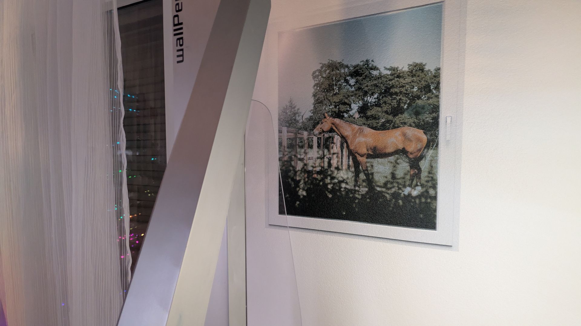 Le projet intègre une illustration personnalisée de l’enfant, des couleurs soigneusement choisies et des éléments graphiques créant un univers unique. Une fenêtre illustrée donnant sur une prairie avec un cheval vient compléter la scène et apporte profondeur et imagination à la pièce.